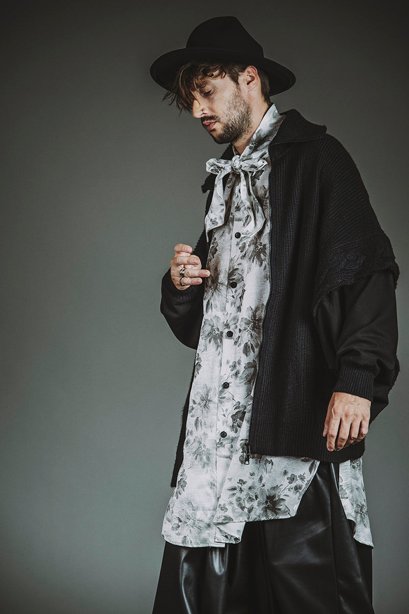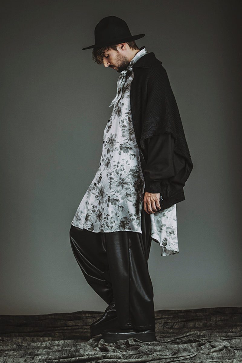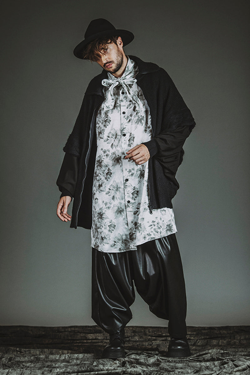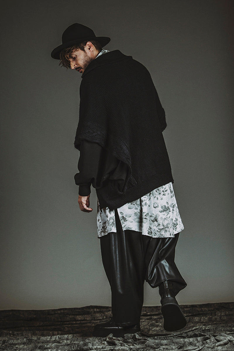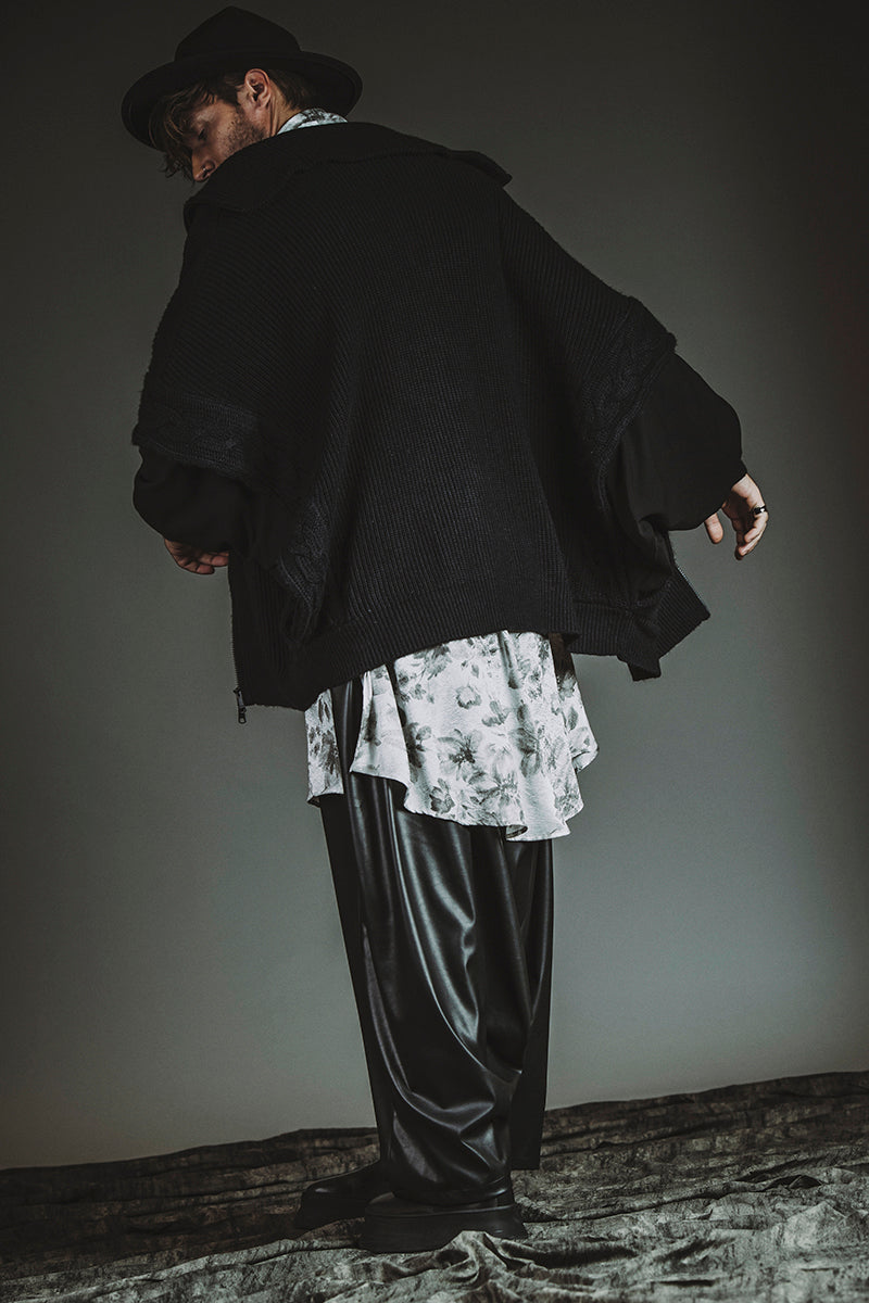 ドッキングニットドルマンZIP-BLZ ¥25,300 モディファイBIG-SH ¥17,600 シンセティックレザーサルエルトラウザーズ ¥18,700 マウンテンハット ¥5,280 クインテッドリング ¥6,380 ディストーションリング ¥6,380 カウレザープラットフォームレースアップブーツ ¥66,000