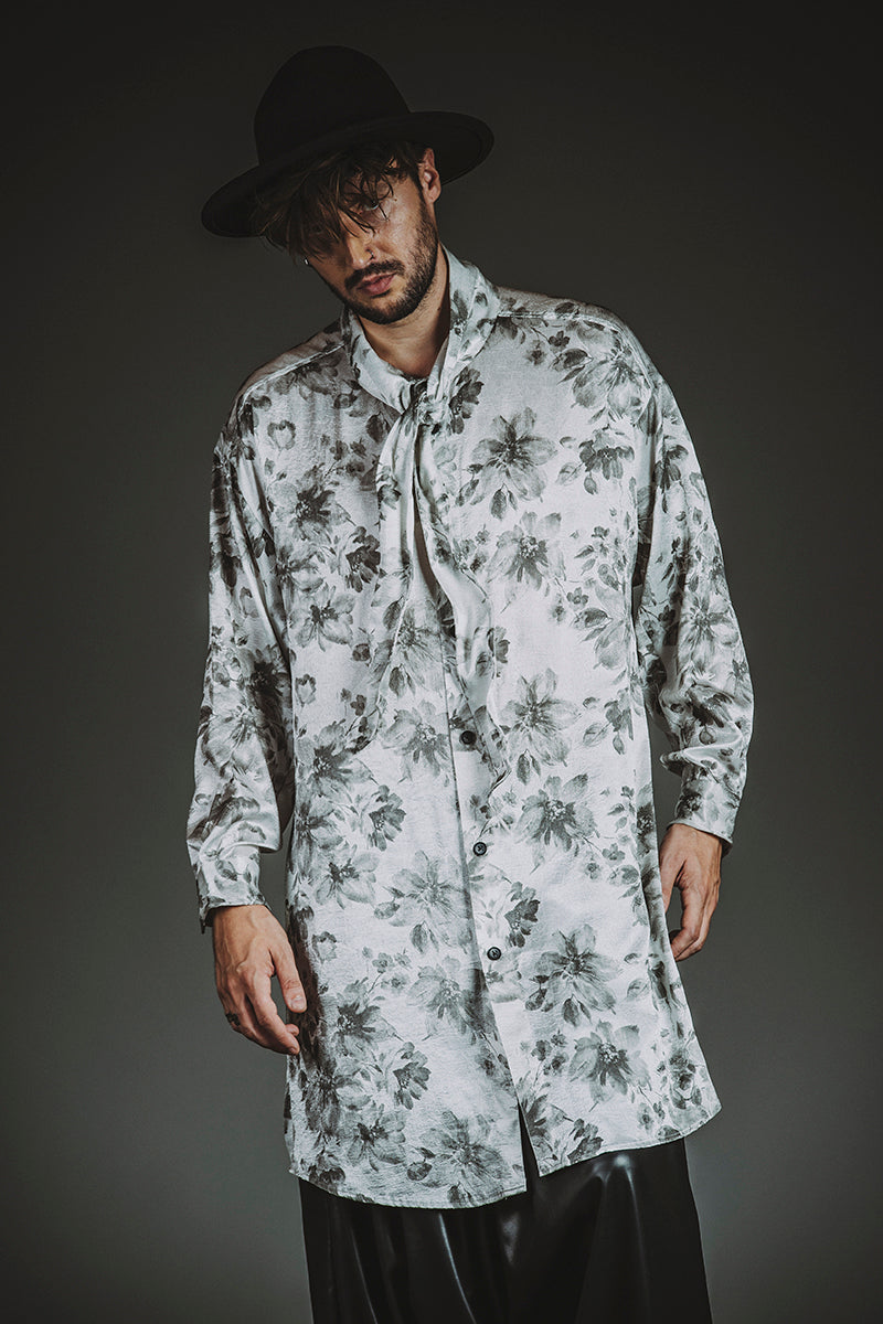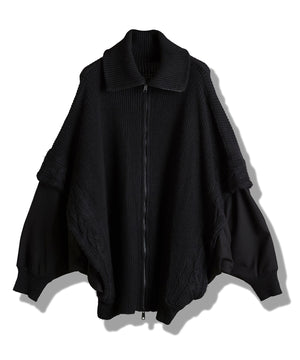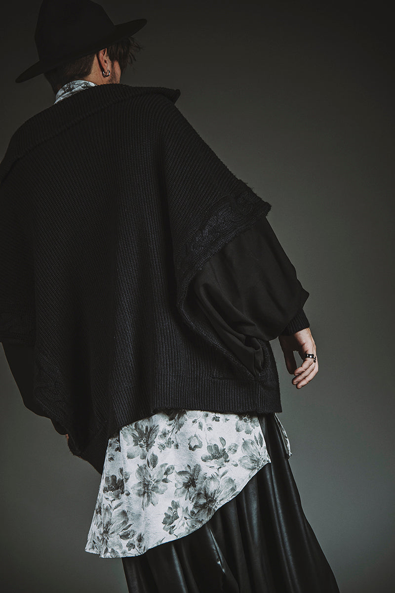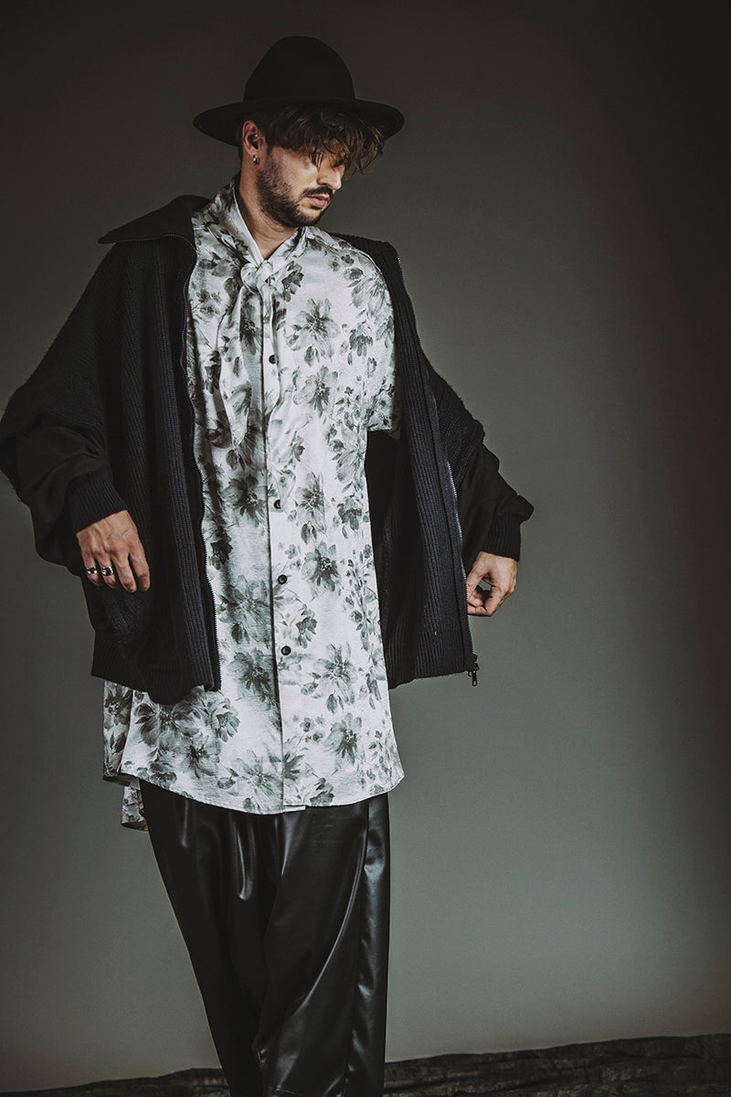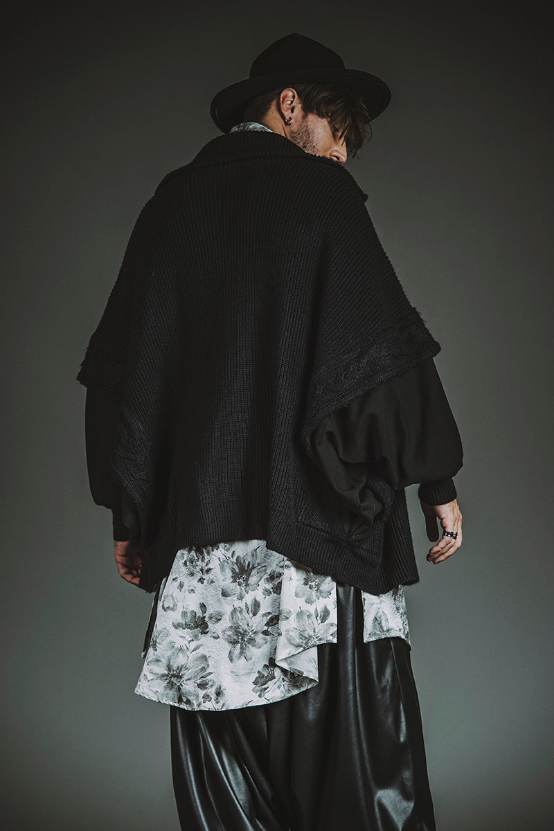 ドッキングニットドルマンZIP-BLZ ¥25,300 モディファイBIG-SH ¥17,600 シンセティックレザーサルエルトラウザーズ ¥18,700 マウンテンハット ¥5,280 クインテッドリング ¥6,380 ディストーションリング ¥6,380 カウレザープラットフォームレースアップブーツ ¥66,000