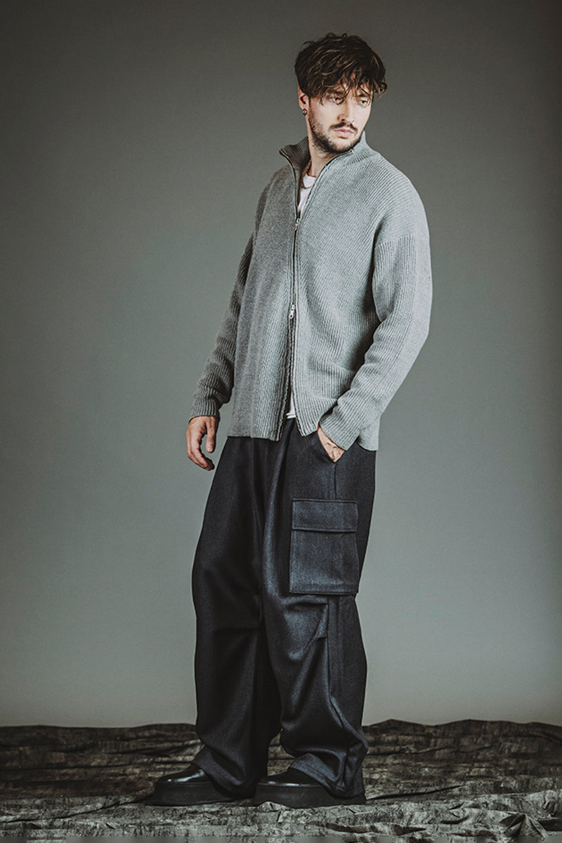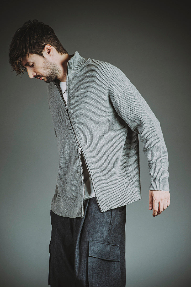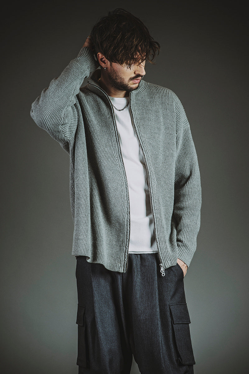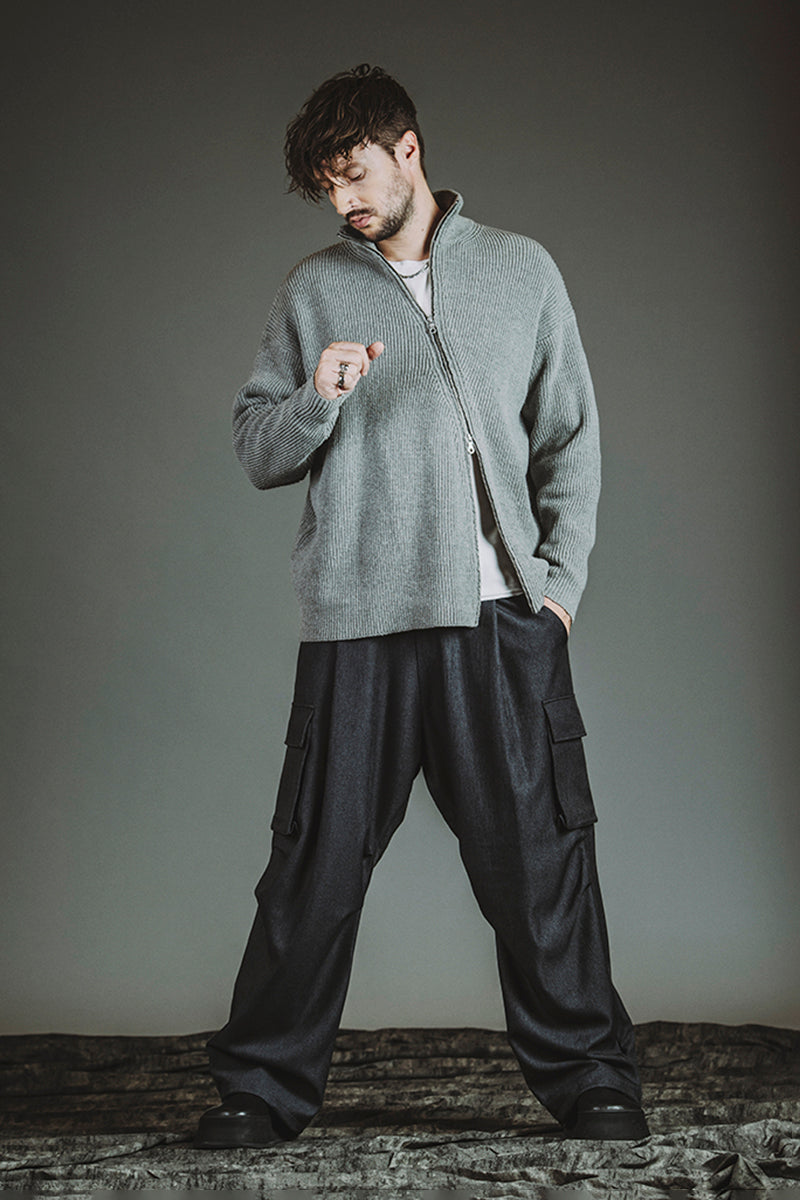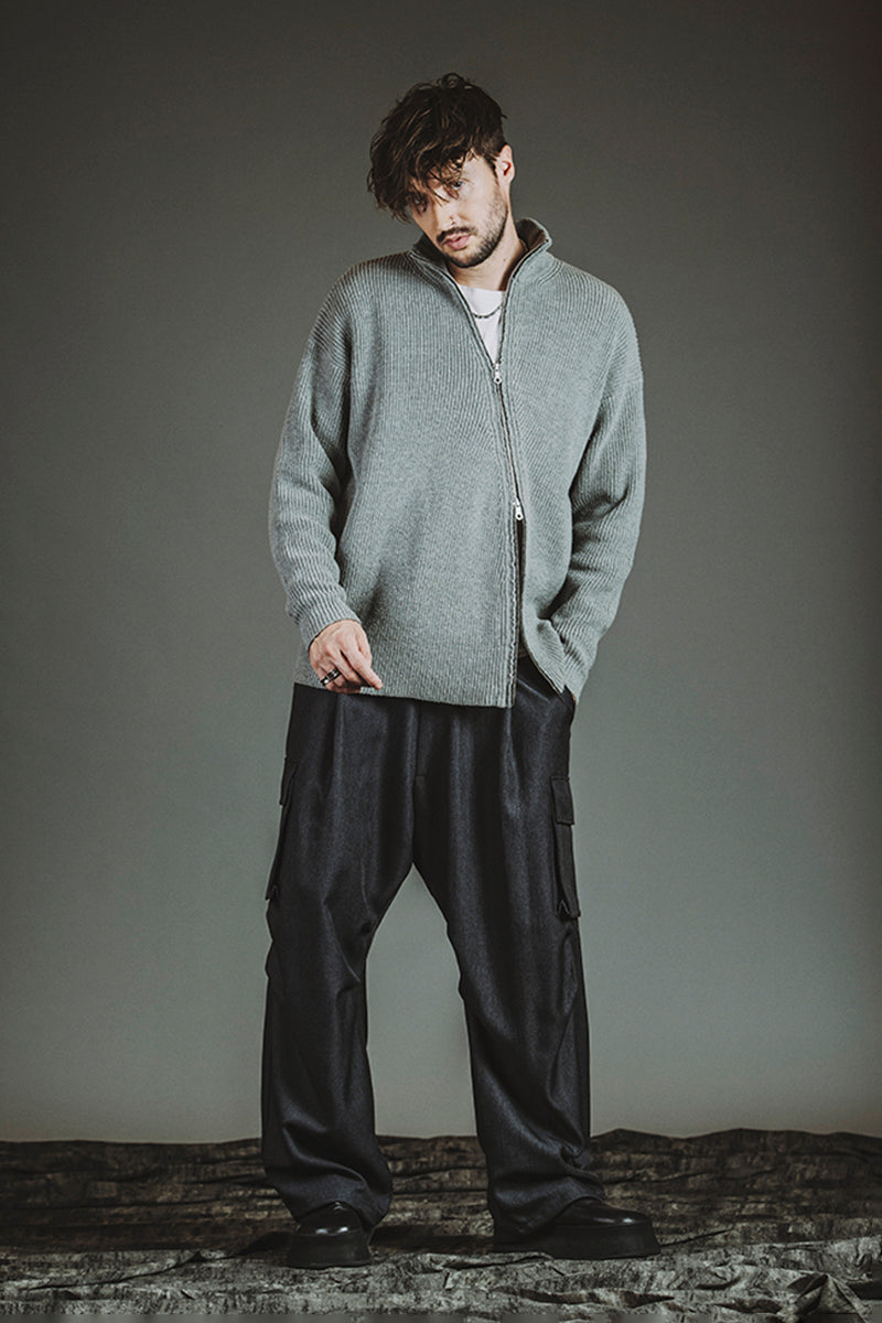 アシンメトリ-ドライバーズニットCD ¥19,800 チェンジングC/N-PO ¥10,780 イージーバギーパラシュートカーゴトラウザーズ ¥17,600 スクエアアンカーチェーンネックレス ¥7,480 クインテッドリング ¥6,380 ディストーションリング ¥6,380 カウレザープラットフォームレースアップブーツ ¥66,000