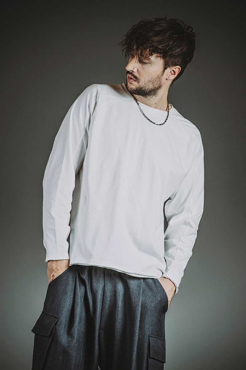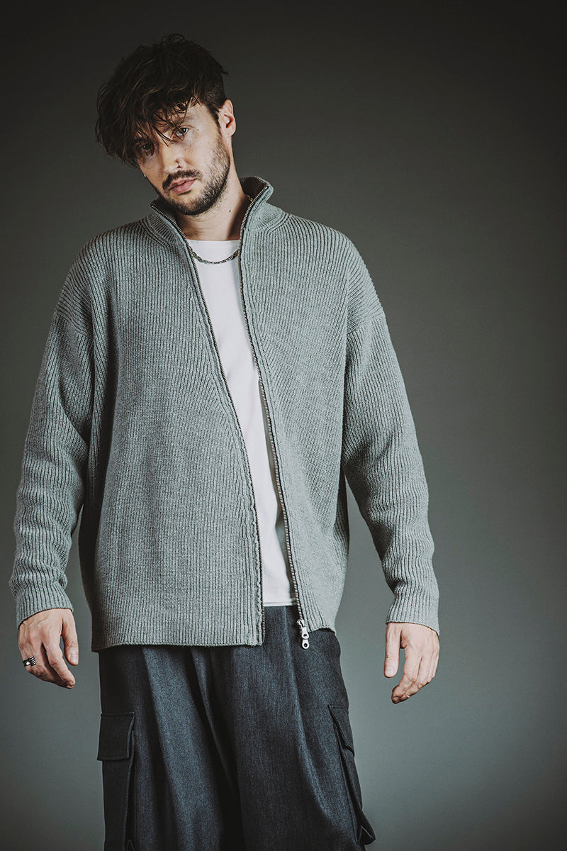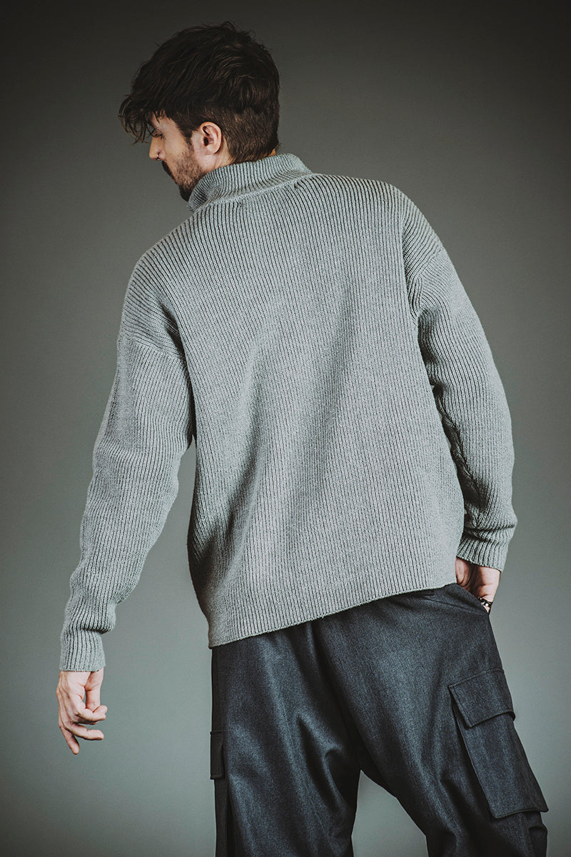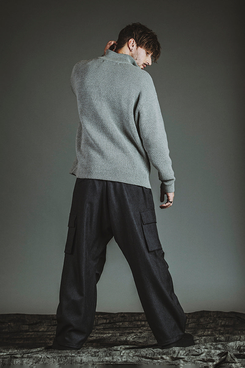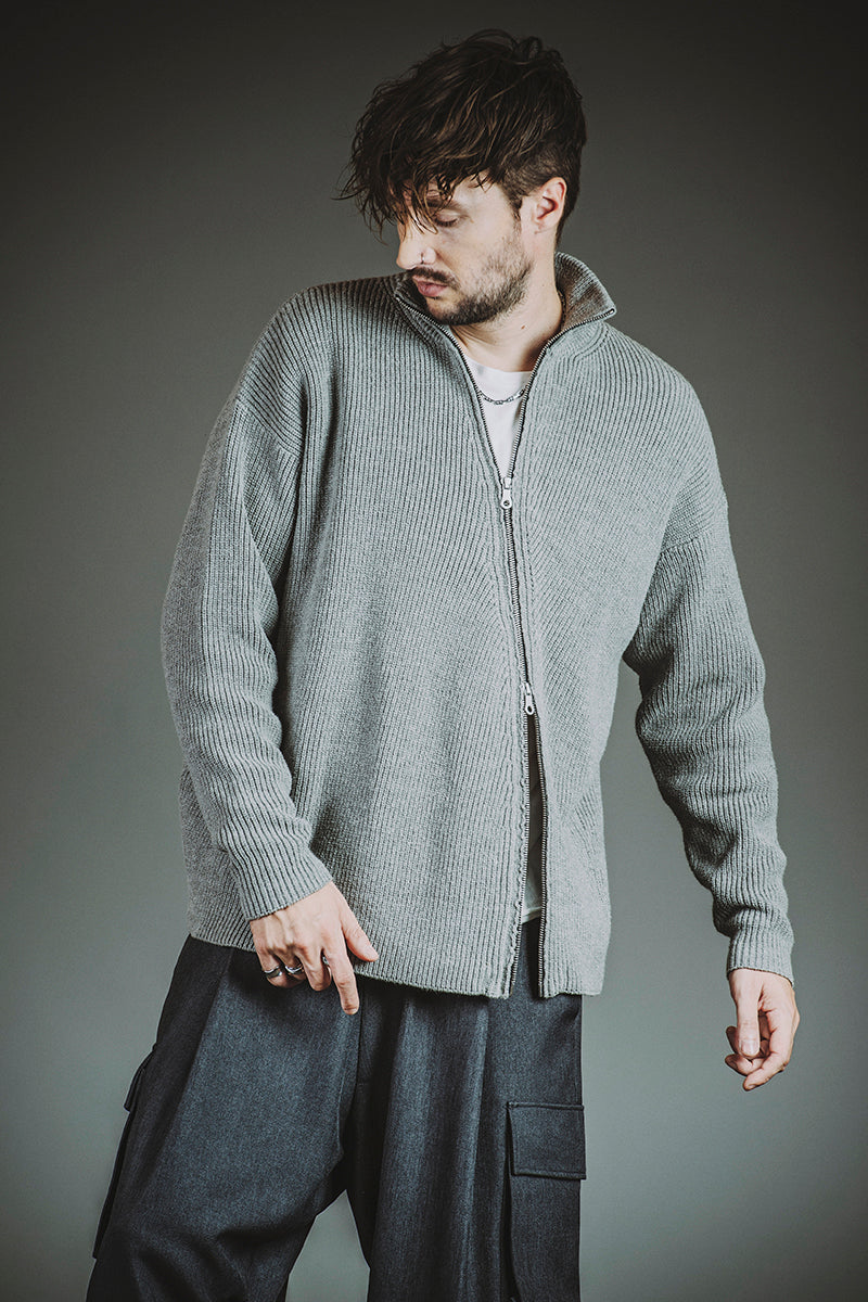 アシンメトリ-ドライバーズニットCD ¥19,800 チェンジングC/N-PO ¥10,780 イージーバギーパラシュートカーゴトラウザーズ ¥17,600 スクエアアンカーチェーンネックレス ¥7,480 クインテッドリング ¥6,380 ディストーションリング ¥6,380 カウレザープラットフォームレースアップブーツ ¥66,000