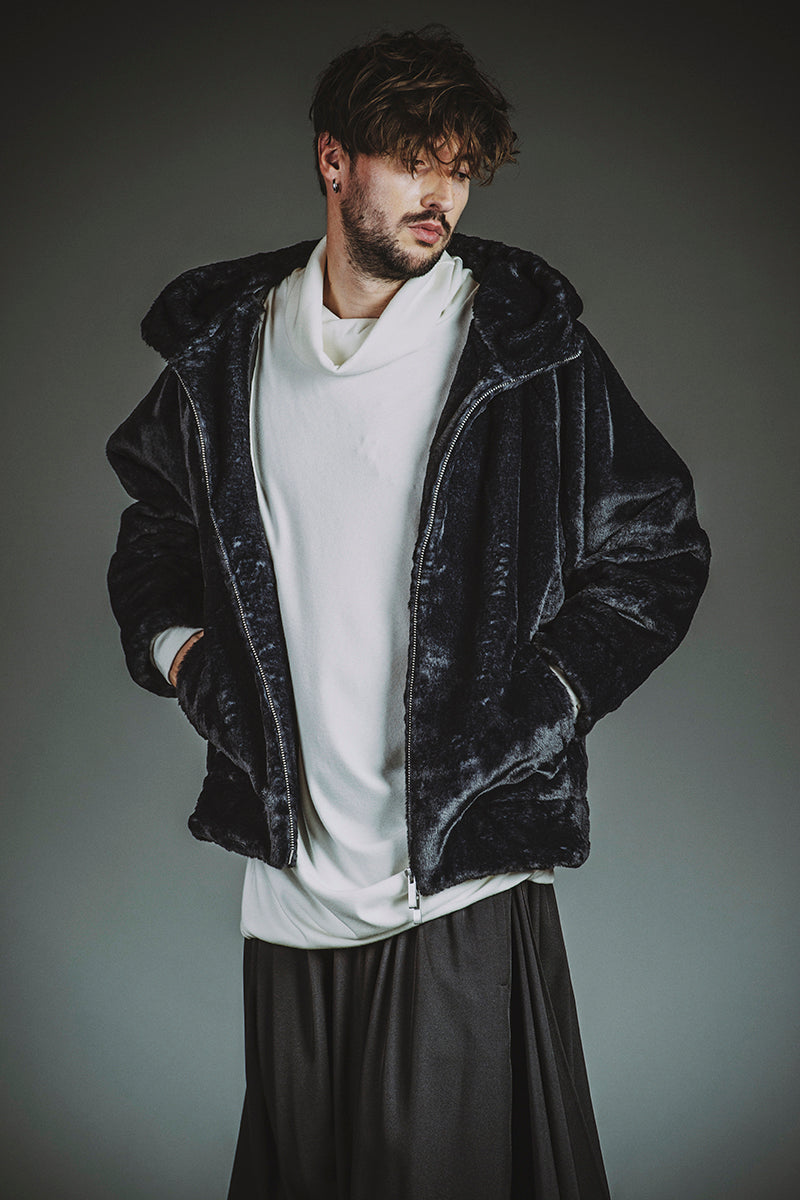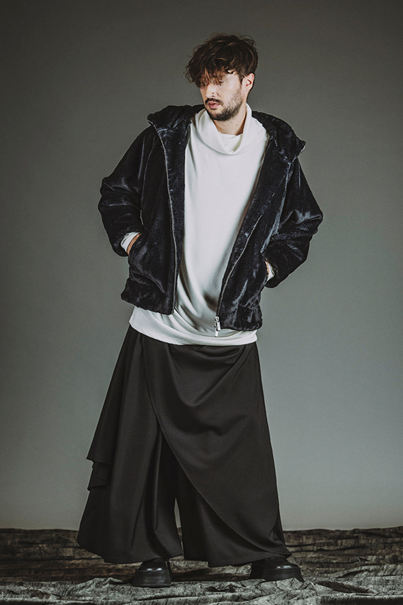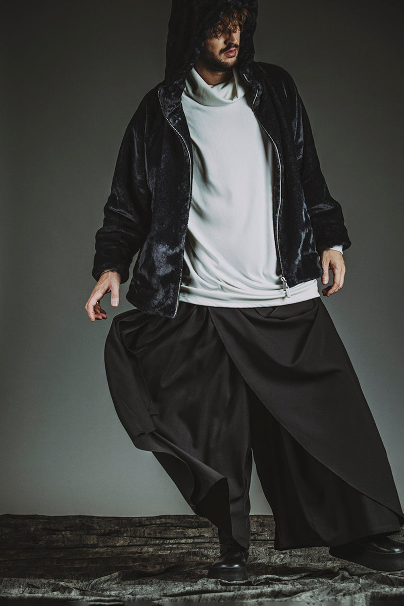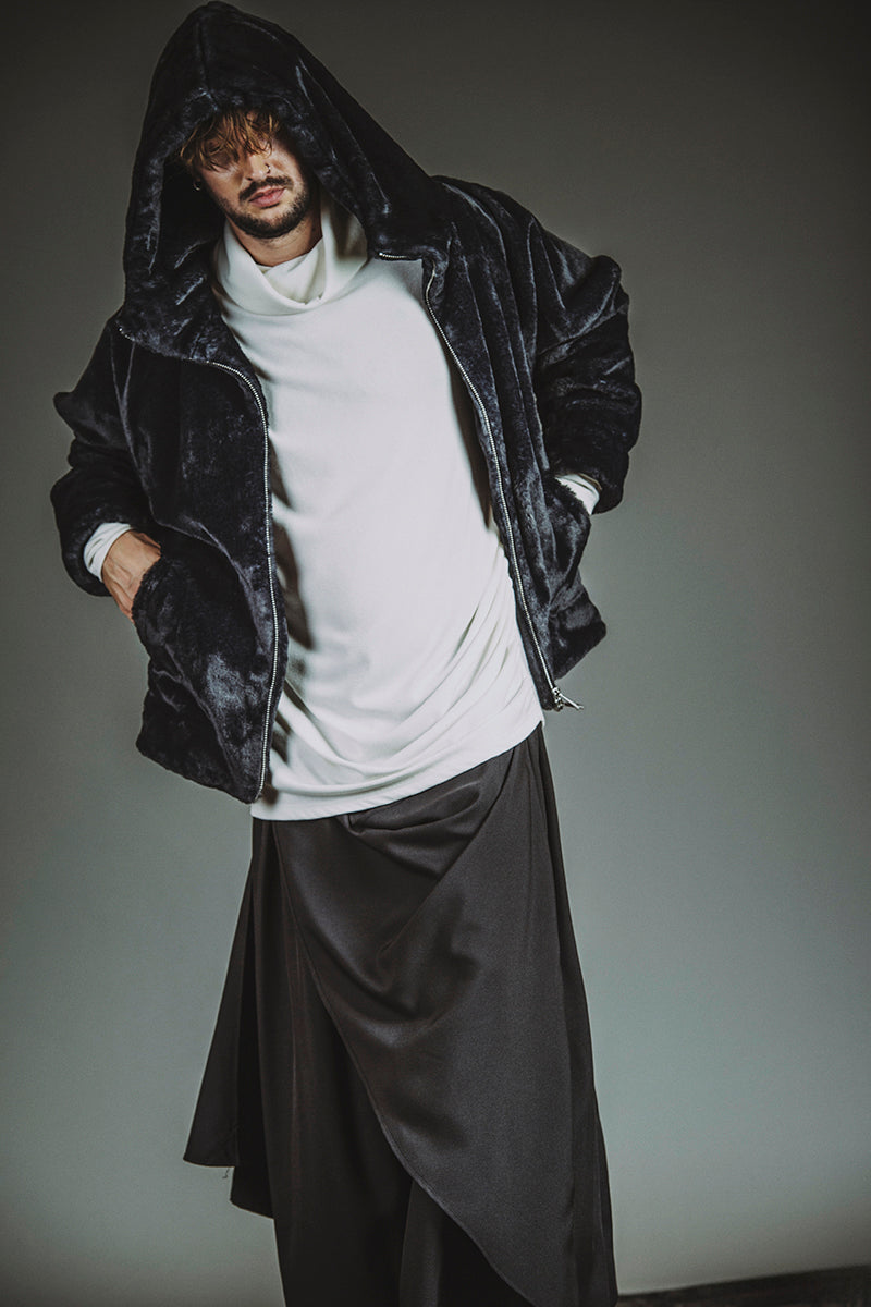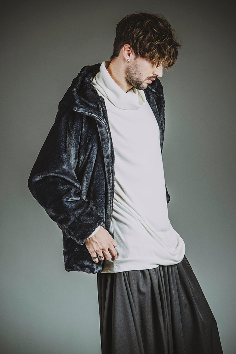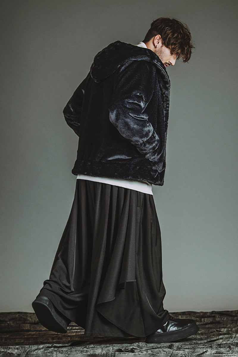 フェイクファーBIGフーデッドBLZ ¥35,200 ボリュームネックギャザードレープPO ¥11,880 ギャザーバギードレープトラウザーズ ¥22,000 クインテッドリング ¥6,380 ディストーションリング ¥6,380 カウレザープラットフォームレースアップブーツ ¥66,000