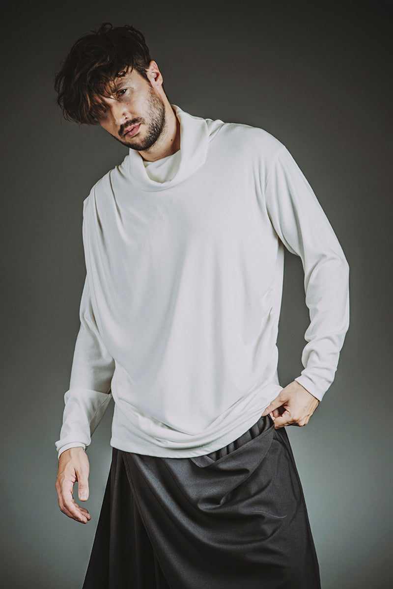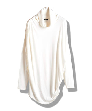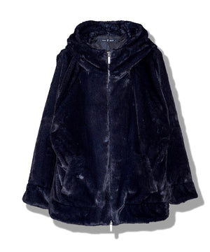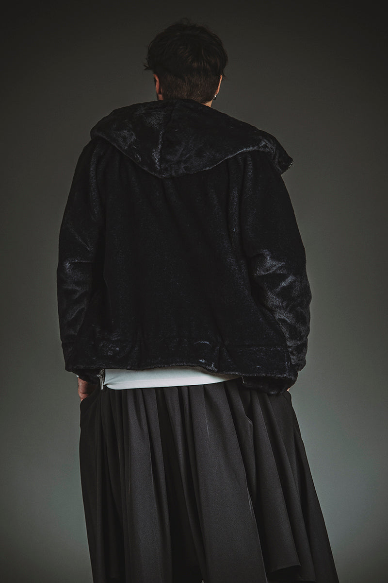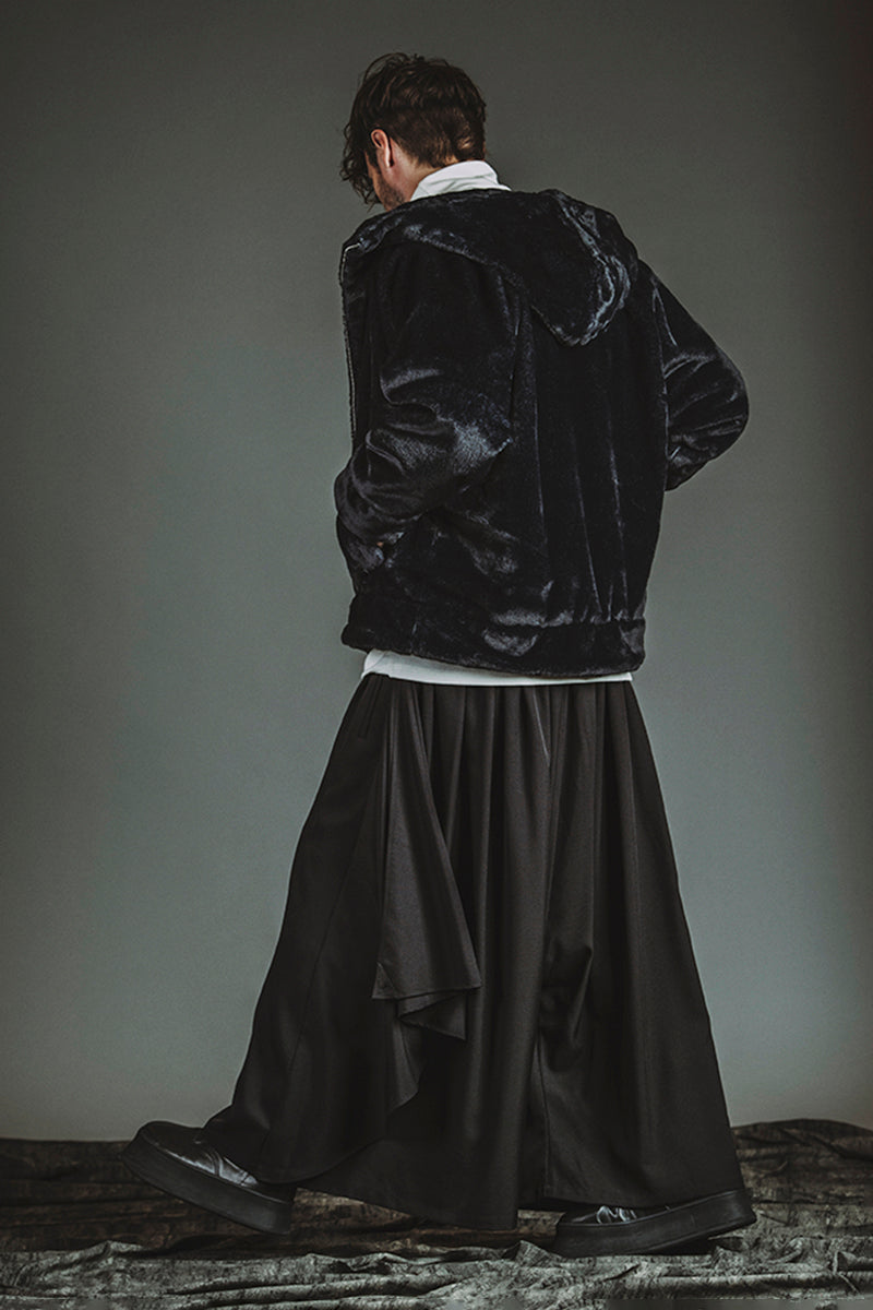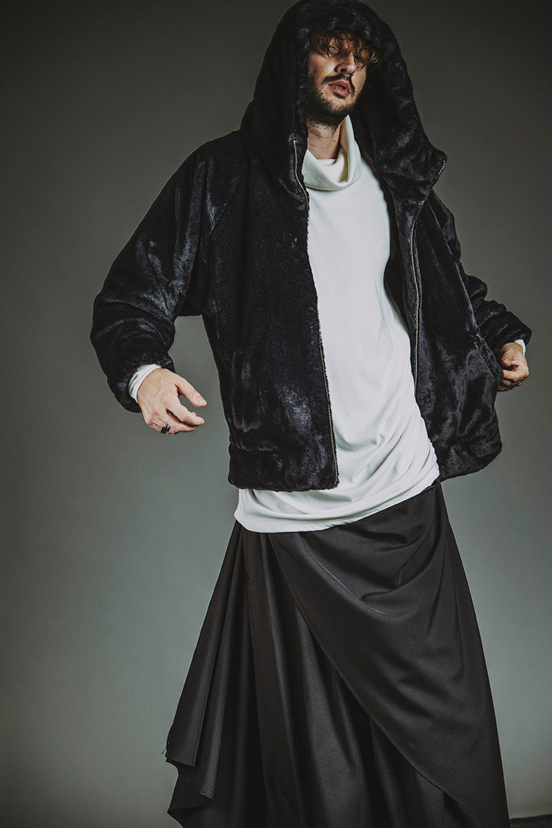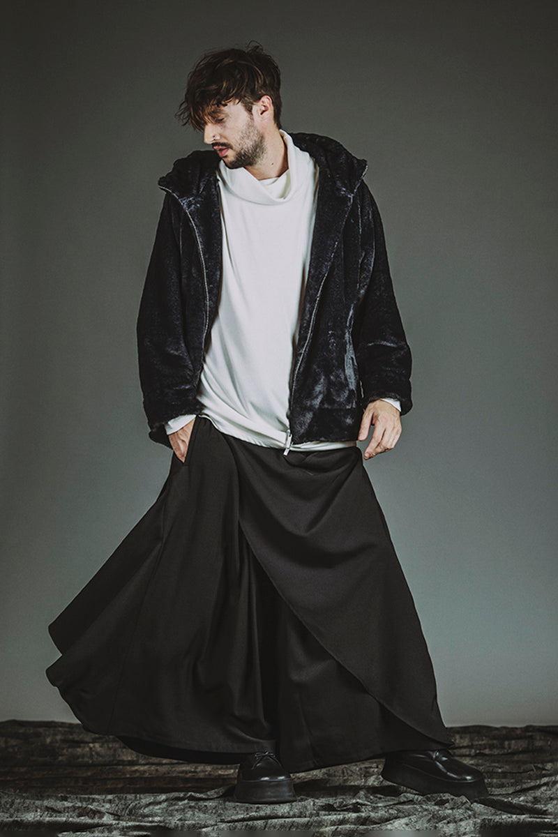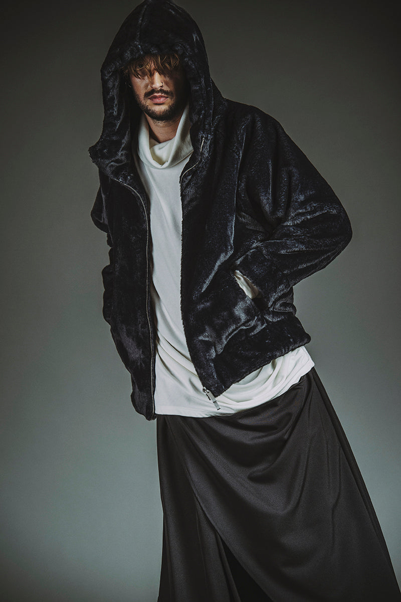 フェイクファーBIGフーデッドBLZ ¥35,200 ボリュームネックギャザードレープPO ¥11,880 ギャザーバギードレープトラウザーズ ¥22,000 クインテッドリング ¥6,380 ディストーションリング ¥6,380 カウレザープラットフォームレースアップブーツ ¥66,000