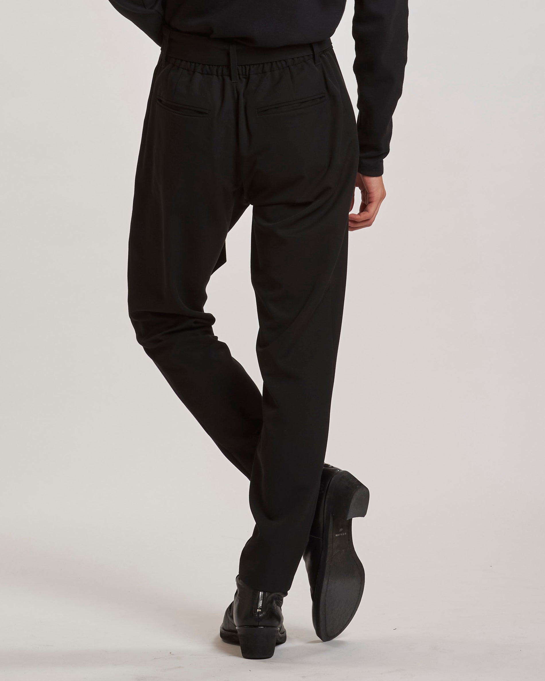 ウエストはゴム仕様で快適な穿き心地ながら、サイドファスナーやベルトでしっかり調整できるので見た目はシャープ。