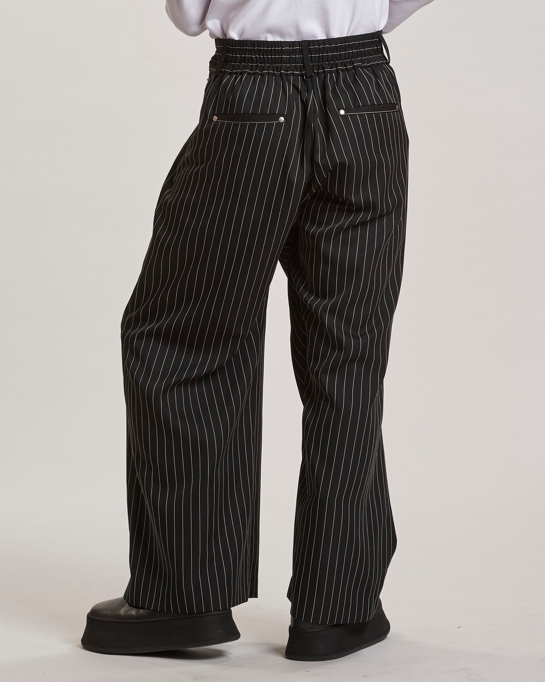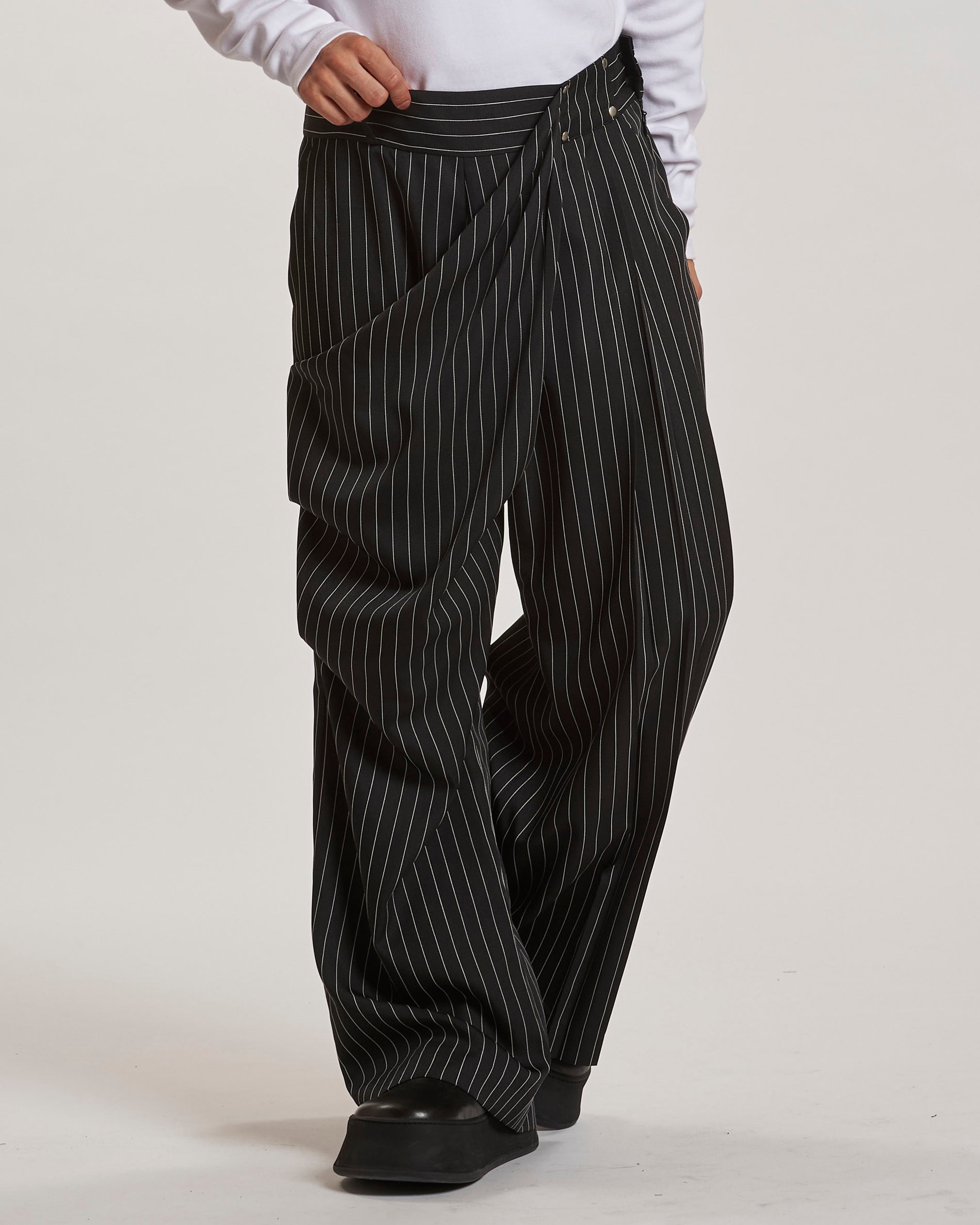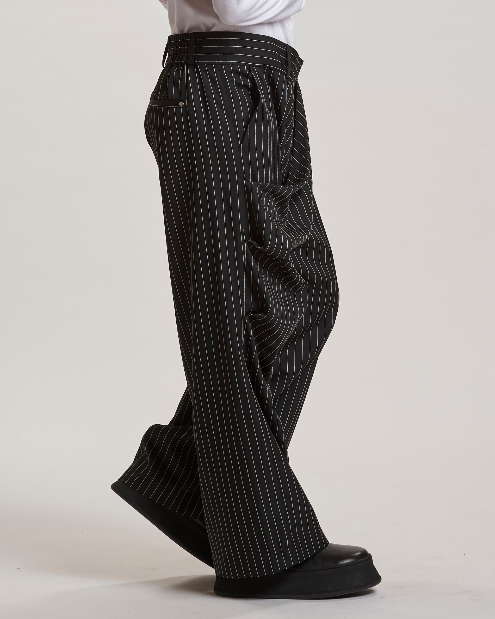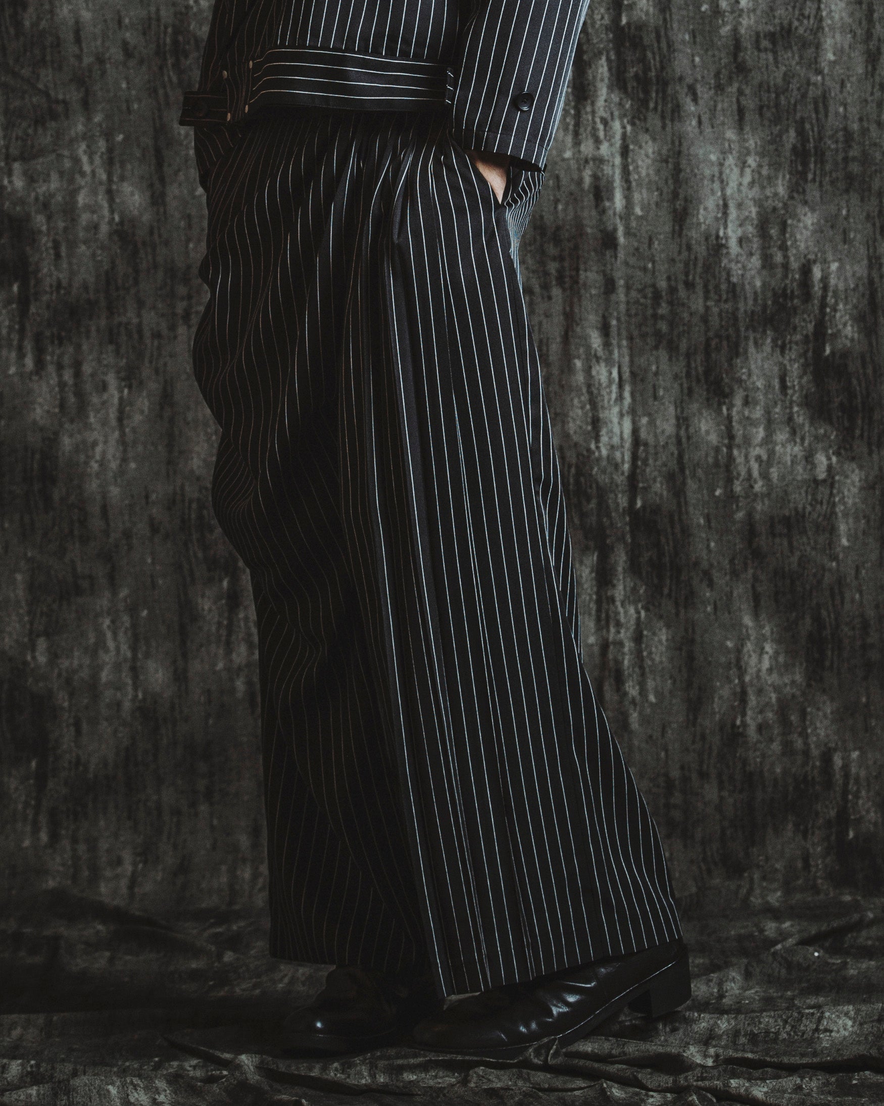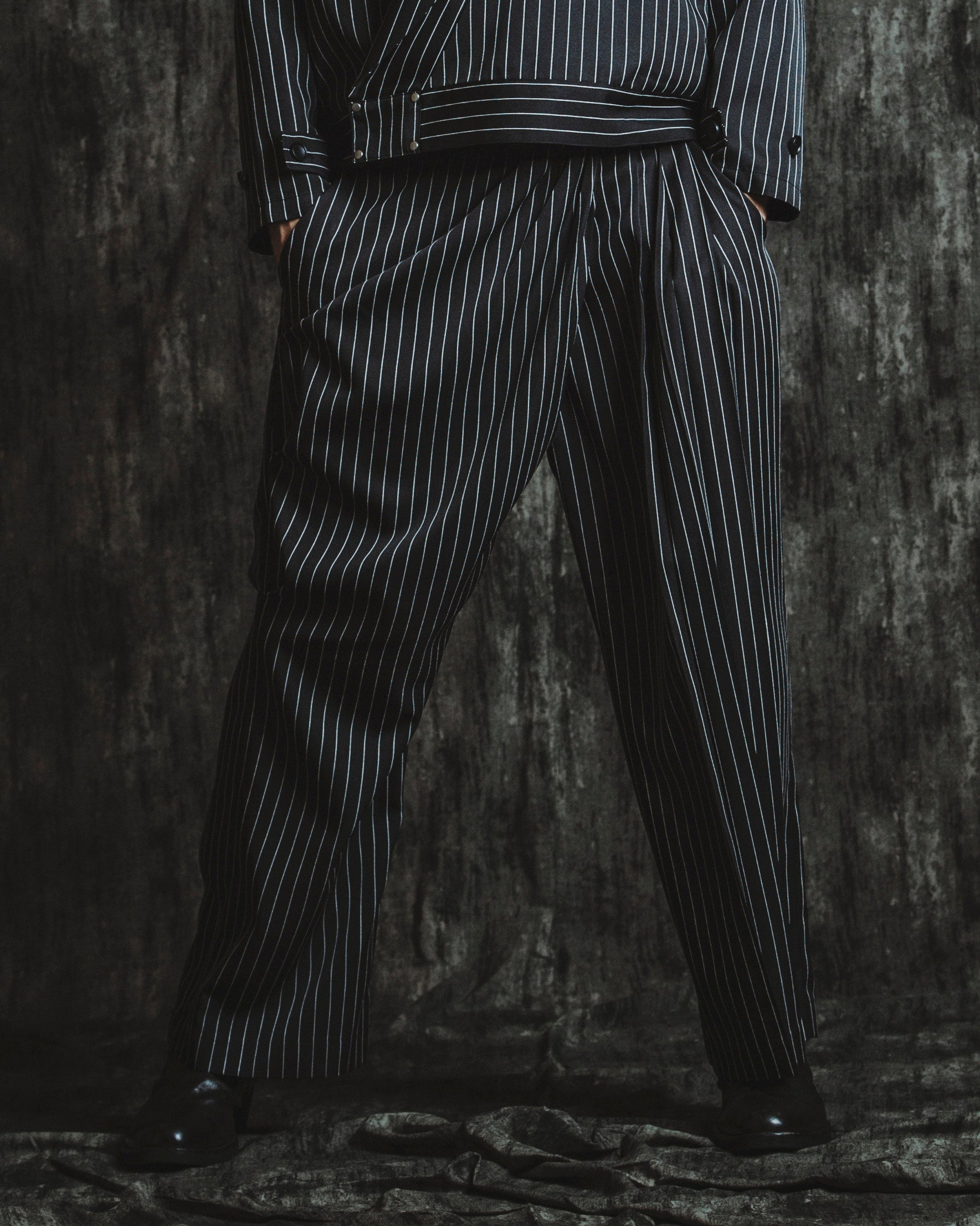 ブラックストライプの生地感が、より一層モードな印象を引き立ててくれます。