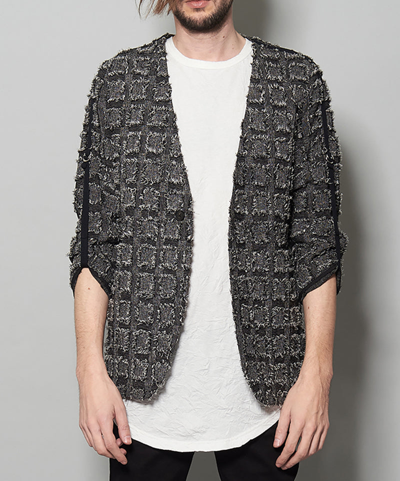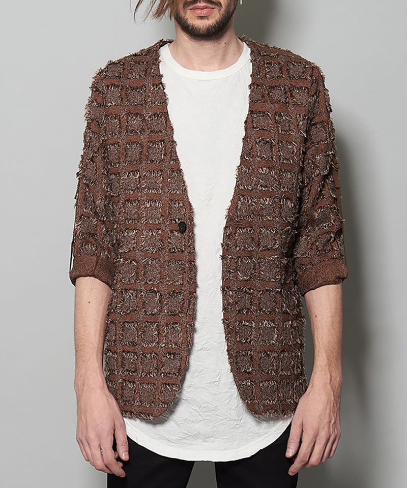 フリンジチェックノーカラー9分袖1B-JKT