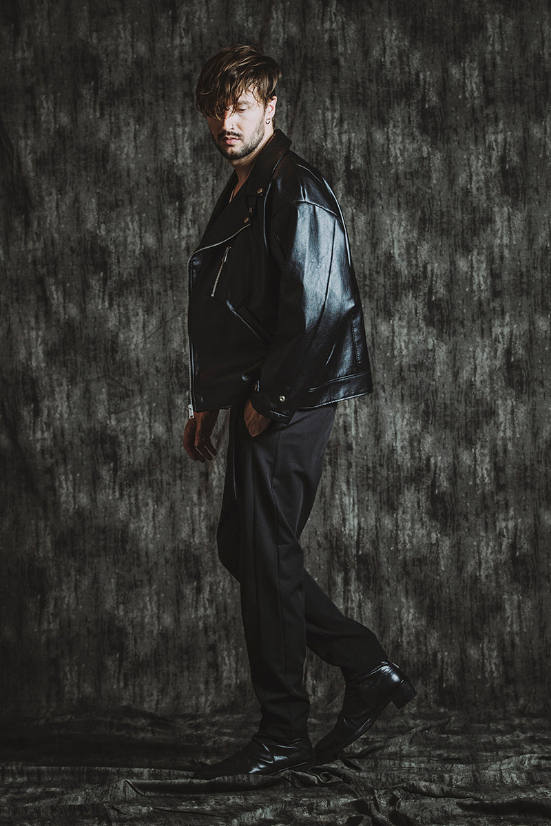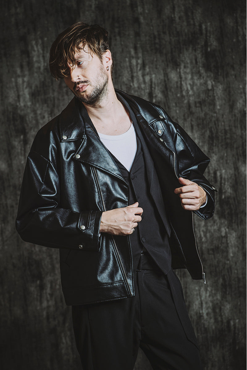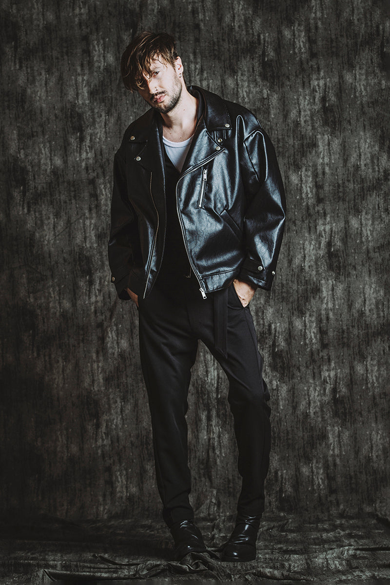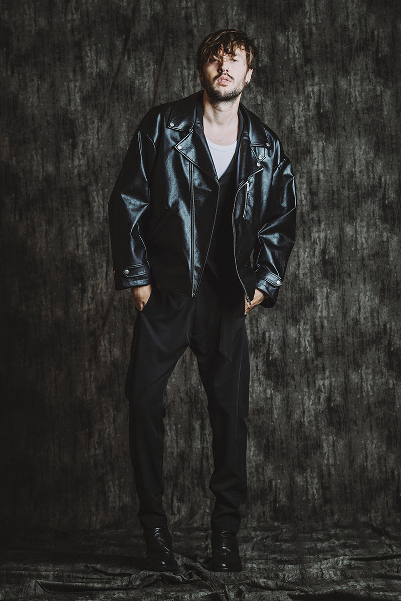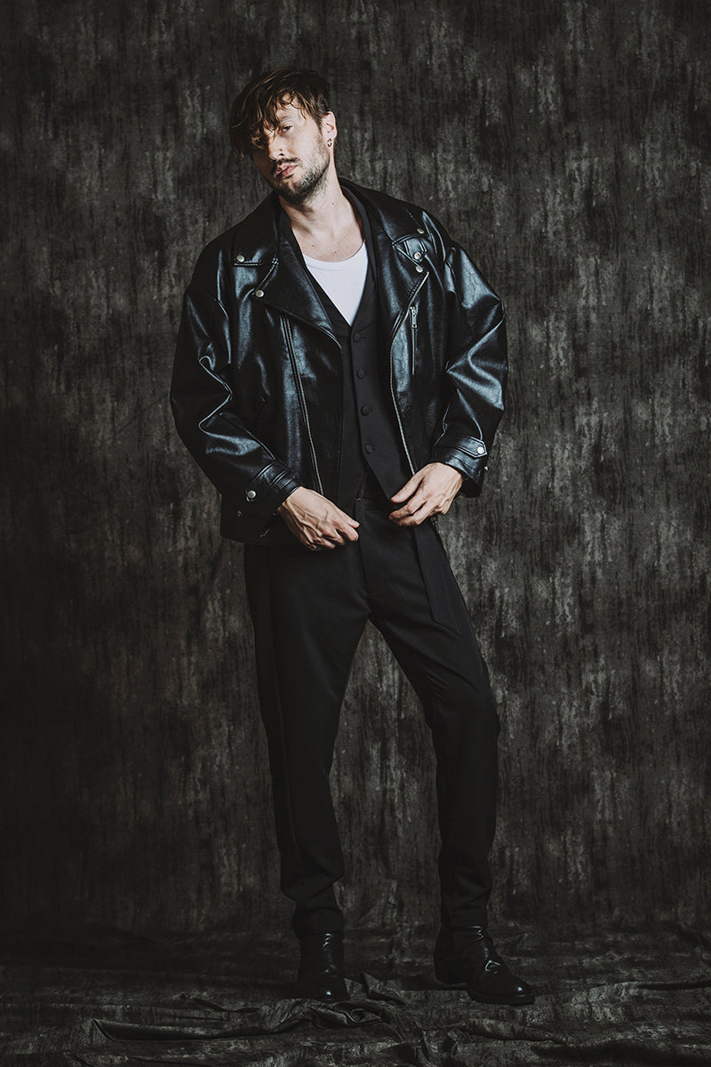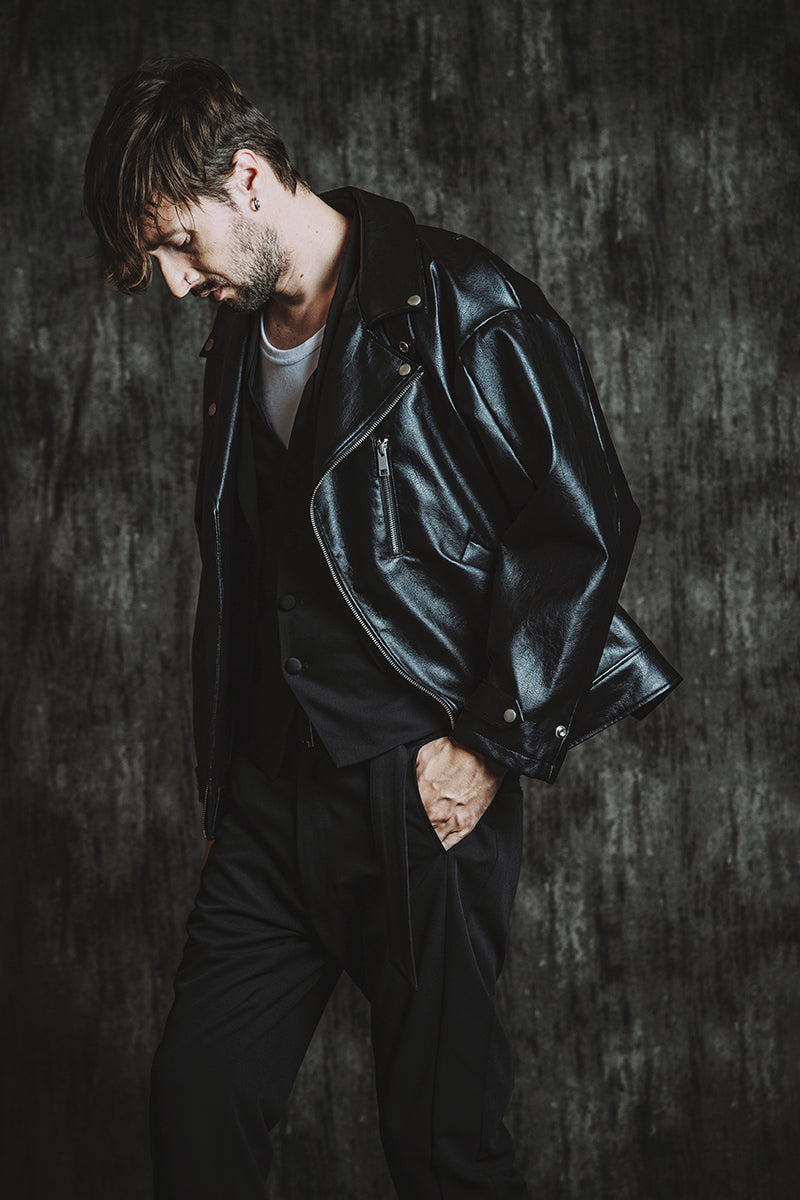 CATALOG 25AW vol5 STYLE08 シンセティックレザーBIGライダースJKT ¥28,600 レイヤードショートJKT ¥28,600 フライスU/N-T ¥8,580 ベルテッドテーパードトラウザーズ ¥17,600 Draped heel boots ¥52,800 OTHER STYLE CATALOG ARCHVE CATALOG TOP 2025AWvol5 2025AWvol4 2025AWvol3 2025AWvol2 2025AWvol1