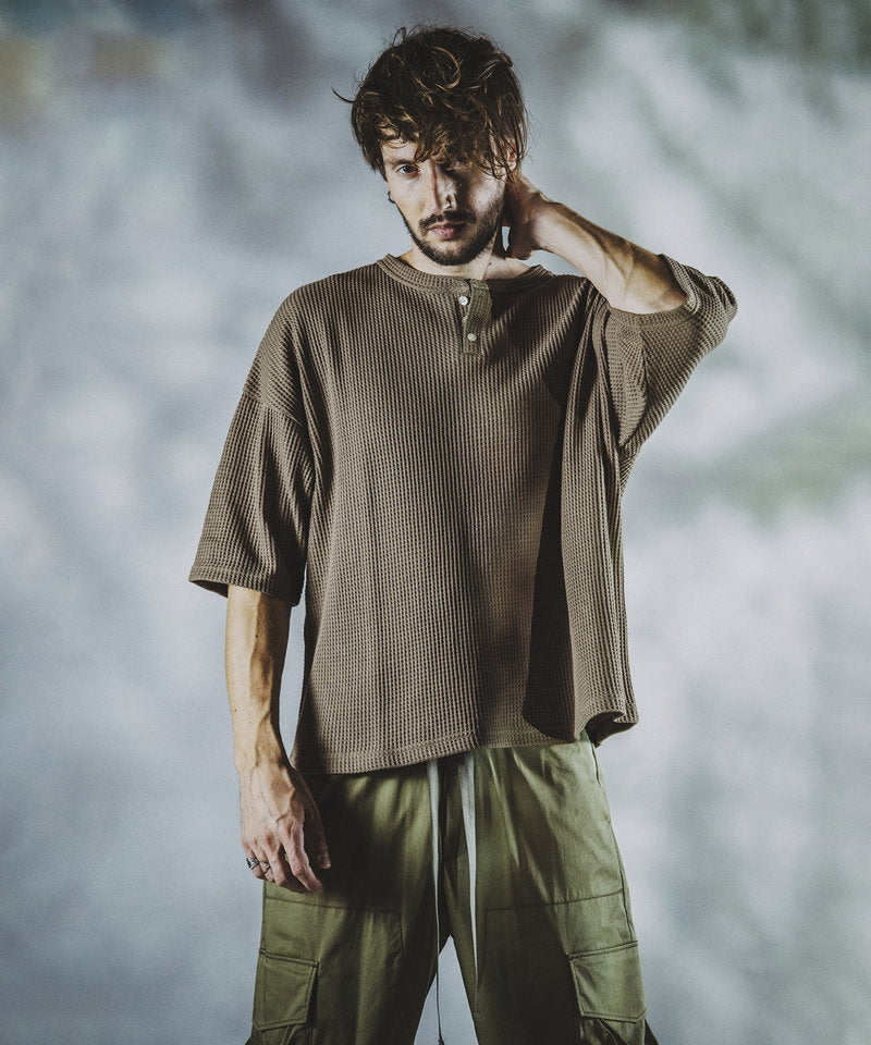 The uneven texture, which is different from regular cut-and-sew, adds a sense of presence even when worn alone. This item features a Henley neck with a placket in the center of the collar.