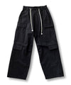 Side straps and waist buttons to fasten suspenders have been omitted, and the highly decorative design has been arranged with cargo pockets at the knees, a characteristic of cargo pants, attached below the knees.
