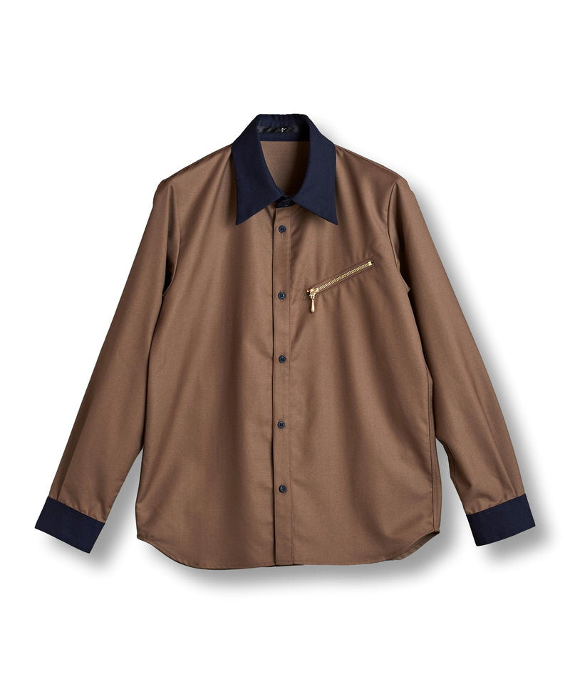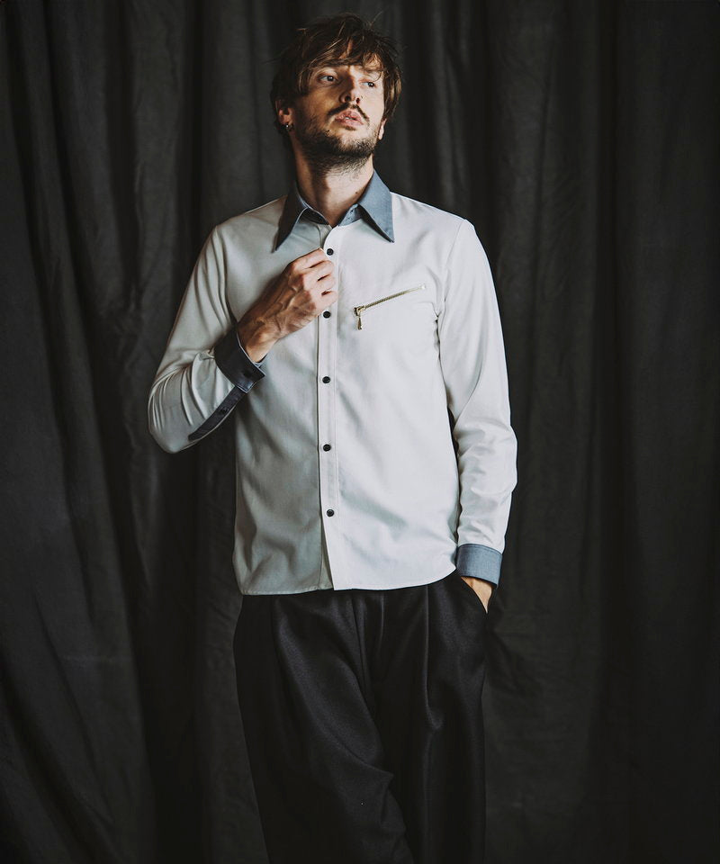 Based on a clerical shirt with an eye-catching color scheme of the collar and cuffs, this piece adds a unique touch to this authentic item with a zipper on the chest that is typical of NO ID. The key point is the look of the zipper that peeks out casually when the jacket is worn.