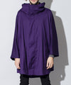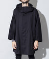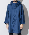 スーツに使用するTR素材を用いることでオーバーサイズながら着心地が軽く、縦に落ち感のあるモードなポンチョが完成。大振りなサイジングは重ね着もし易く裏地も付いている仕様の為、厚手のスウェットやニット、軽めのアウターをインナーとして合わせても着膨れした印象が出ず