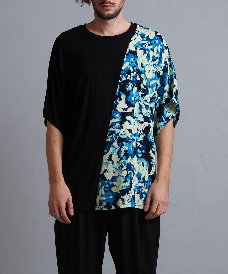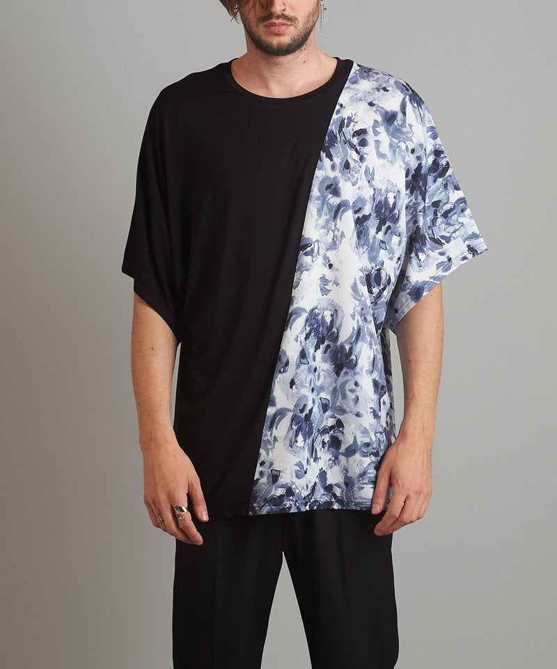 アシンメトリーに切り替えを施し無地と柄の明確なコントラストが映えるデザインとなっている。