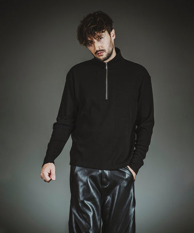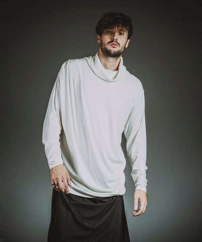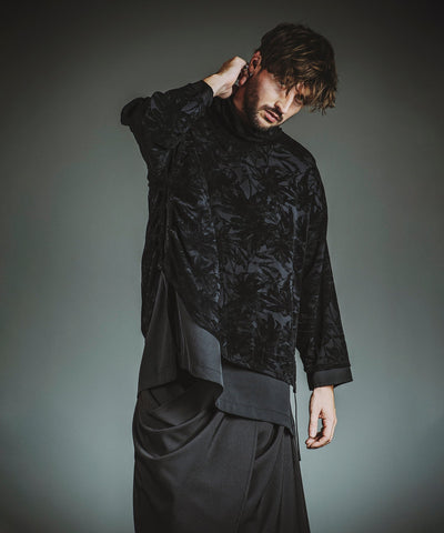 シアーカットソーと布帛素材をレイヤーした異素材コンビのBIGプルオーバー。 極薄手のチュール素材を用いたカットソーと、ドライタッチでナチュラルな風合いの布帛インナーシャツを重ねることで、立体感と動きのある表情を実現。 背面切替にはメローロックを採用し、カットソーのサイドにはドローコードを配して、身頃のドレープやニュアンスを自由に調整可能です。 袖丈や着丈に長短差をつけたレイヤードデザインが、個性的でモードな印象を演出します。