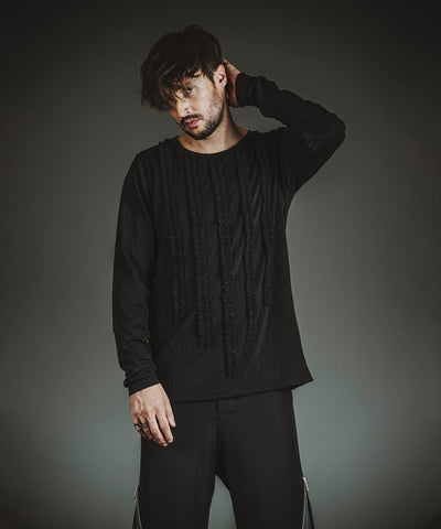 2種類の生地をドッキングして1枚でレイヤードしている様なスタイリングを構築できるタートルネック。同系色でまとめる事でアクセントのフラワーパターンも馴染みよく表現してされている。
