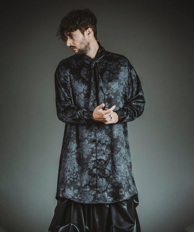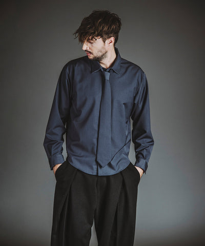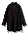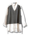 1着でオーバーサイズのプルオーバーシャツとニットベストをレイヤードしているサマを表現したドッキングデザイン。