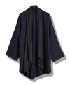 同系色で統一感を与えながら異素材コンビで仕上げたガウン。ボディに付属したボタンにストール部分のホールを取り付ける事で様々なシルエットを楽しめる1枚。今季モデルは背面にバックスリットを施しより軽快さとレイヤードを楽しめる仕様となっている。