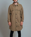 ポリエステルベースの軽量で柔らかな風合いのメルトン素材を使用したシャツライクなロングコート。