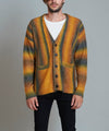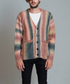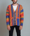独特な配色が特徴的なミックスカラーの糸で編み立てたカラフルなニットカーディガン。
