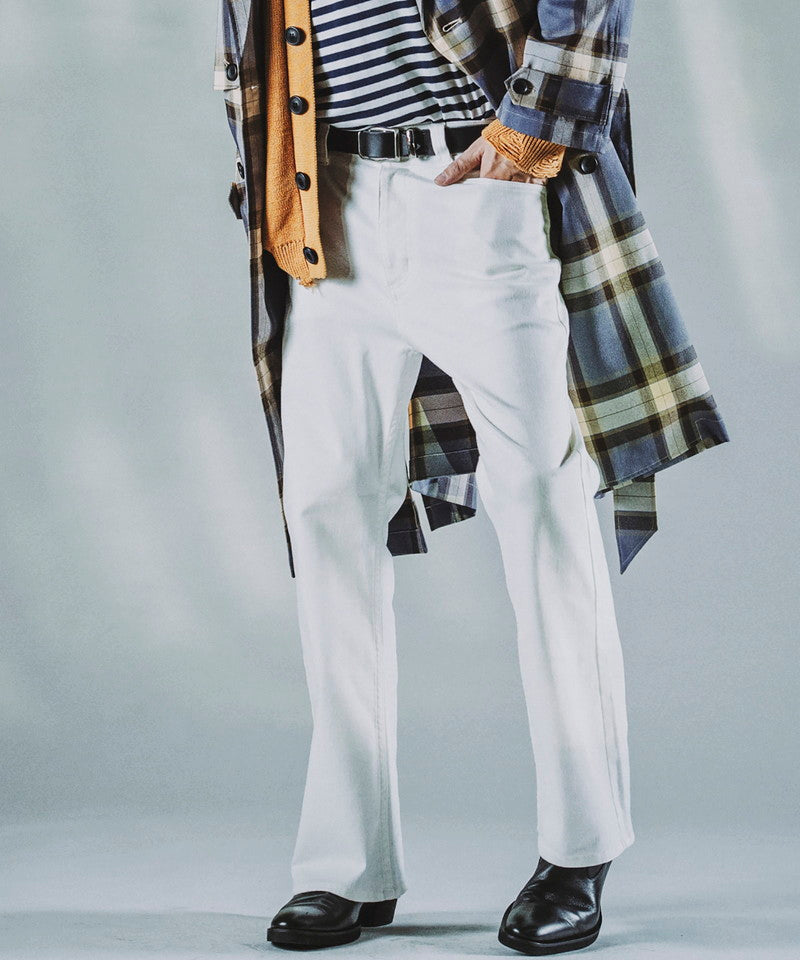 ストレッチ=スキニーの概念を覆した本作は太もも、ヒップにはやや余裕を持たせ膝下から裾にかけて広がるフレアデニムのシルエットを活かした今までとは異なるサイジングに設定。脚のラインを強調させない事でフレアシルエットの脚長効果を引き立てている。